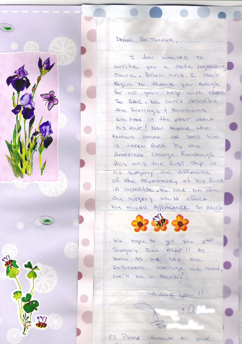 I just wanted to write you a note regarding Chace. Allen and I can't begin to thank you enough for all your help with Chace so far. We can't describe the feelings & reactions we had in the past about his ear! Now anyone who knows Chace or sees him is taken back by the amazing change. Even though this was the first step in his surgery, the difference of the asymmetry of his face is incredible. We had no idea the surgery would effect his overall appearance so much. We hope to get the 2nd surgery done ASAP! As soon as we get the insurance coverage we need, we'll be in touch!