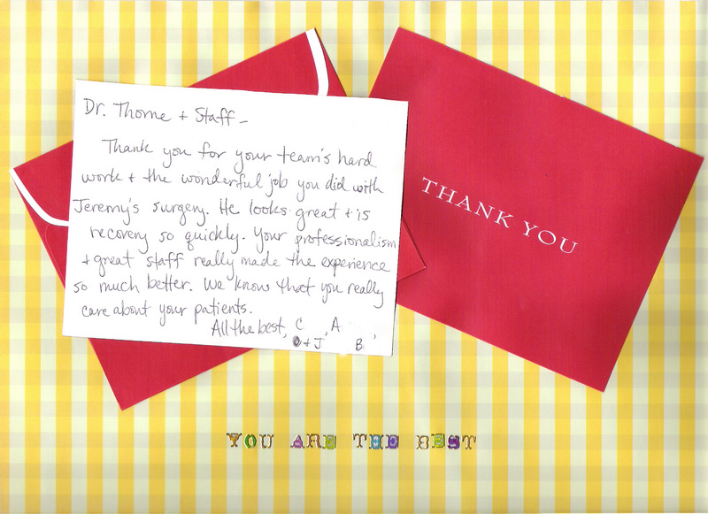 Thank you for your team's hard work and the wonderful job you did with Jeremy's surgery. He looks great and is recovering so quickly. Your professionalism and great staff really made the experience so much better. We know that you really care about your patients.