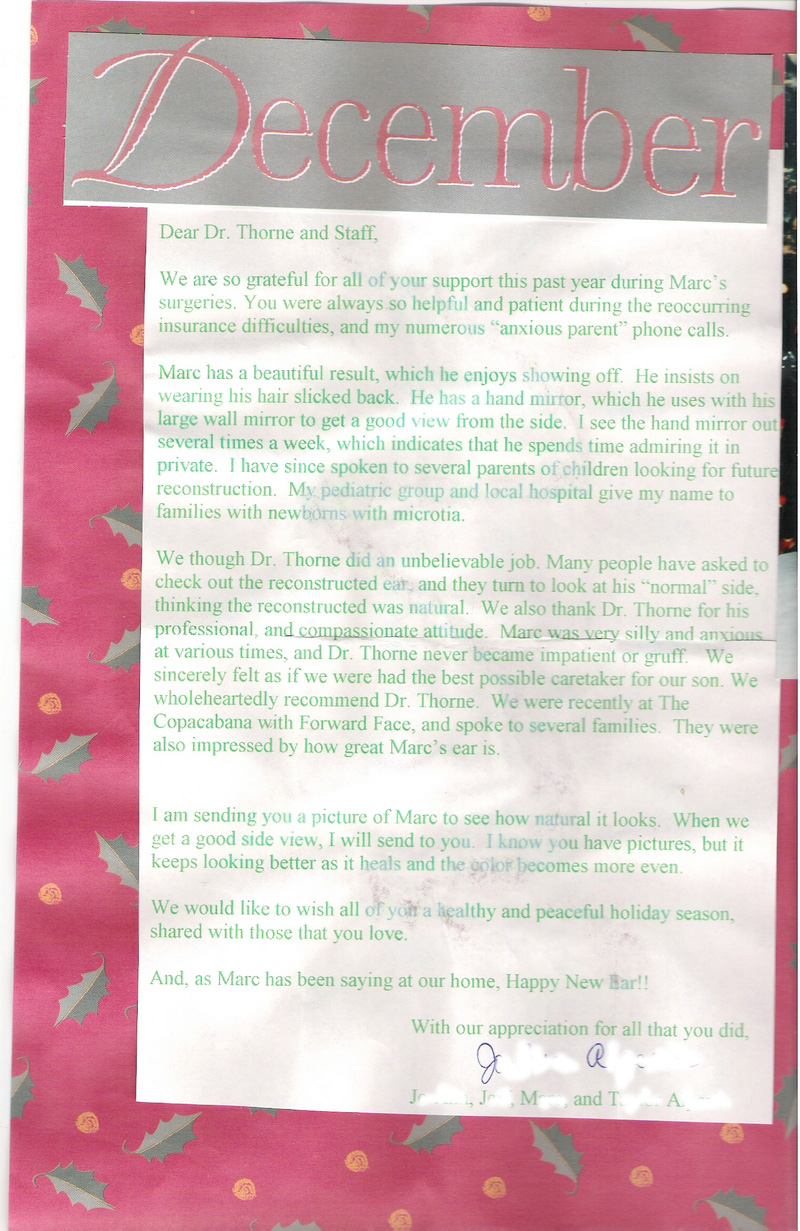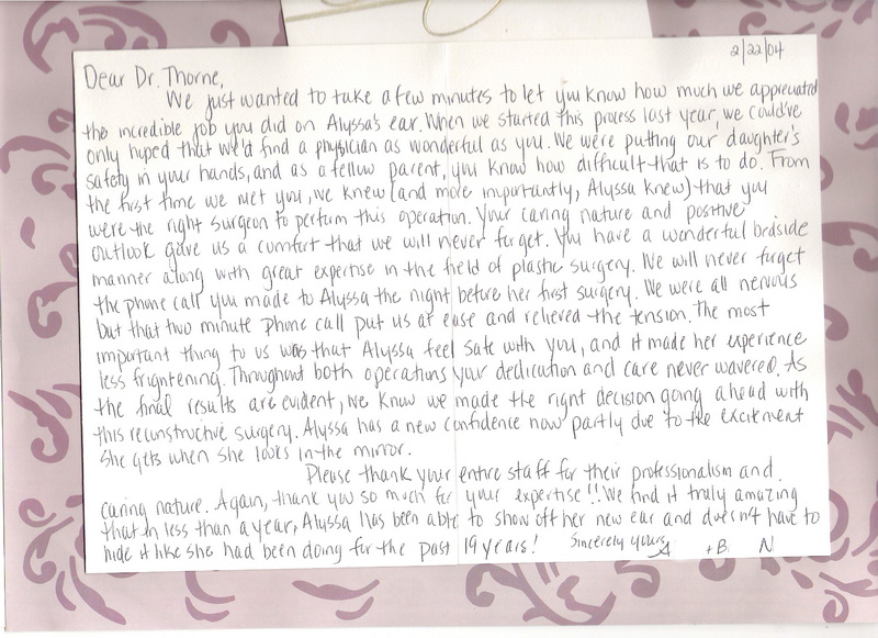 We just wanted to take a few minutes to let you know how much we appreciated the incredible job you did on Alyssa's ear. When we started this process last year, we could've only hoped that we'd find a physician as wonderful as you. We were putting our daughter's safety in your hands, and as a fellow parent, you know how difficult that is to do. From the first time we met you, we knew (and more importantly, Alyssa knew) that you were the right surgeon to perform this operation. Your caring nature and positive outlook gave us a comfort that we will never forget. You have a wonderful bedside manner along with great expertise in the field of plastic surgery.