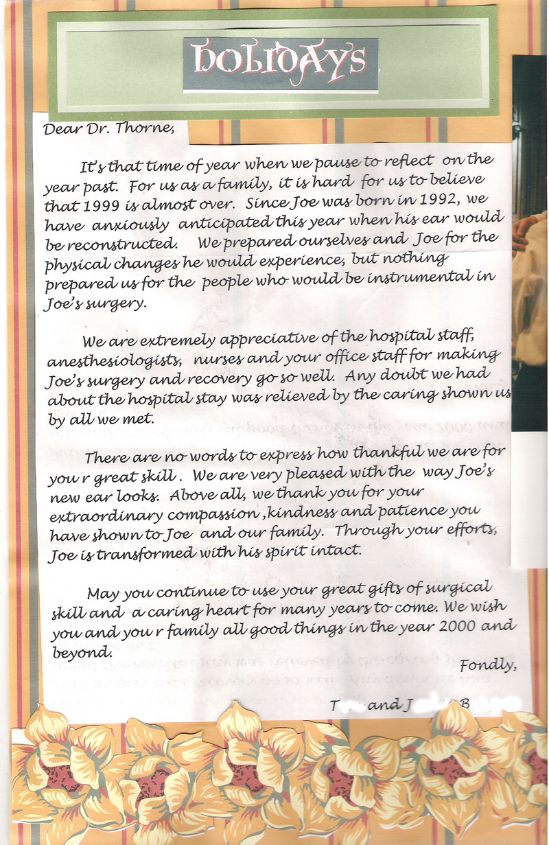 There are no words to express how thankful we are for your great skill. We are very pleased with the way Joe's new ear looks. Above all, we thank you for your extraordinary compassion, kindness and patience you have shown to Joe and our family. Through your efforts, Joe is transformed with his spirit intact.