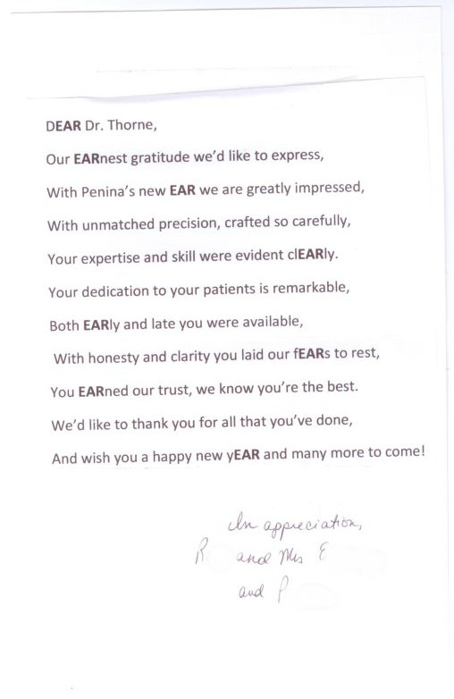 Please thank your entire staff for their professionalism and caring nature. Again, thank you so much for your expertise! We find it truly amazing that in less than a year, Alyssa has been able to show off her new ear and doesn't have to hide it like she had been doing for the past 19 years!